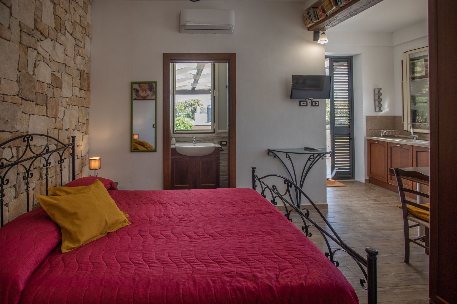 Camera spaziosa, climatizzata, con ingresso indipendente. Dispone di 1 letto matrimoniale e bagno privato. Questa camera è dotata di angolo cucina ben attrezzata di frigorifero, piano cottura, stoviglie e set preparazione caffè e tè. Dispone di spazio esterno arredato riservato con vista giardino.